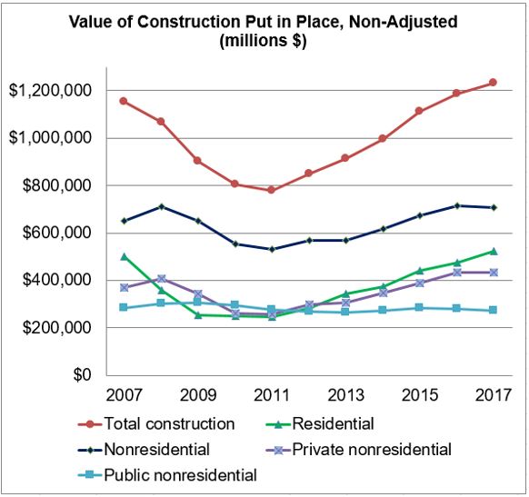 U.S put-in-place construction spending grew an estimated 3.8% in 2017 to $1.23 trillion, based on U.S. Commerce statistics, not seasonally adjusted.