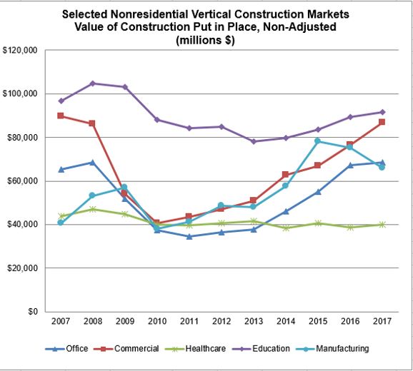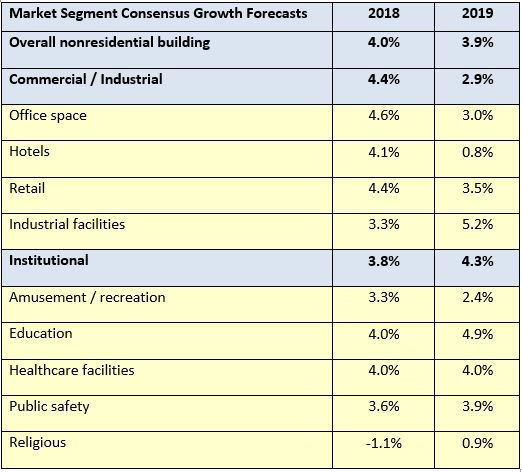 For 2018, the American Institute of Architects’ (AIA) semi-annual Consensus Construction Forecast is projecting growth in overall nonresidential building construction spending of 4%. The commercial construction sectors are expected to generate much of the expected gains this year, and by 2019 the industrial and institutional sectors will dominate the projected construction growth.