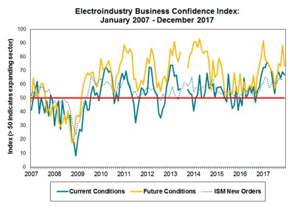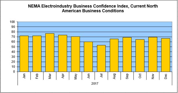 The electrical industry expressed optimism about current economic conditions during every month of 2017. The National Electrical Manufacturers Association’s (NEMA) Electroindustry Business Conditions Index (EBCI) for current conditions in North America stayed at or above a score of 50 throughout the year, ending with a solid 66.7. The future conditions component similarly remained in expansionary territory at the end of the year even as the topline reading declined to 73.3 from November’s 88.5.