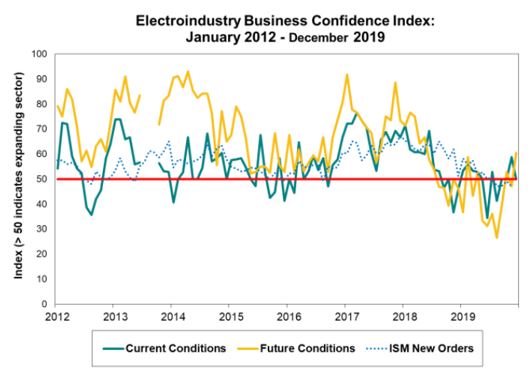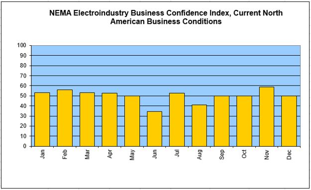 Electrical industry business confidence underwent a turbulent year, with unease and uncertainty about trade, weakness in the industrial sector, and impeachment in Congress. The National Electrical Manufacturers Association’s (NEMA) Electroindustry Business Conditions Index (EBCI) for current conditions in North America declined below or teetered at the expansionary score of 50 during six months of the year, ending at a score of 50.