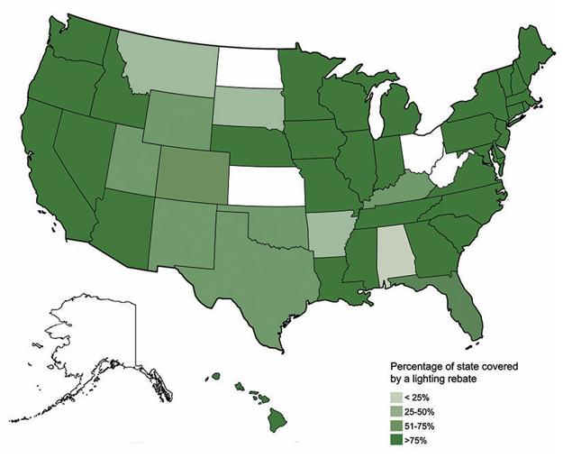 Utilities and energy efficiency organizations offer rebates as an investment in reducing electric demand, thereby avoiding the higher cost of acquiring new generating capacity. These rebates focus heavily on lighting and are primarily targeted to existing buildings. According to rebate fulfillment provider BriteSwitch, which shared its 2023 North American rebate database, nearly 80% of the United States is covered by an active commercial lighting rebate, with the strongest programs in the Northeast and Northwest.