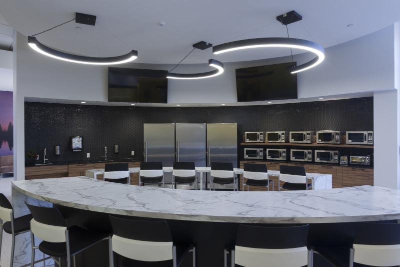 Employee cafeteria lighting, separately zoned and dimmed with daylight sensors.