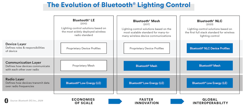 In September 2023, the Bluetooth Special Interest Group (SIG) released Bluetooth® NLC, a series of specifications that define roles and responsibilities for common lighting control devices. Bluetooth NLC builds on wireless standards Bluetooth Low Energy (LE) and Bluetooth Mesh to provide full-stack standardization.
