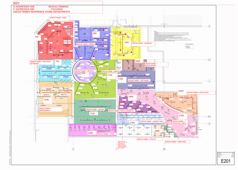 Designers developed a color coded, numerically sequenced “map” of the store’s lighting to facilitate commissioning of wireless LED track lights and LED cylinder luminaires.