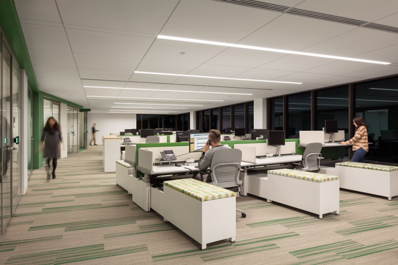 Prior to renovation, perimeter enclosed offices blocked access to daylight. Switched fluorescent parabolic troffers and high partitions isolated workers and decreased lighting efficiency.