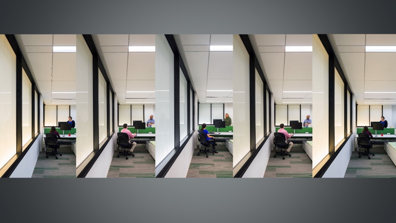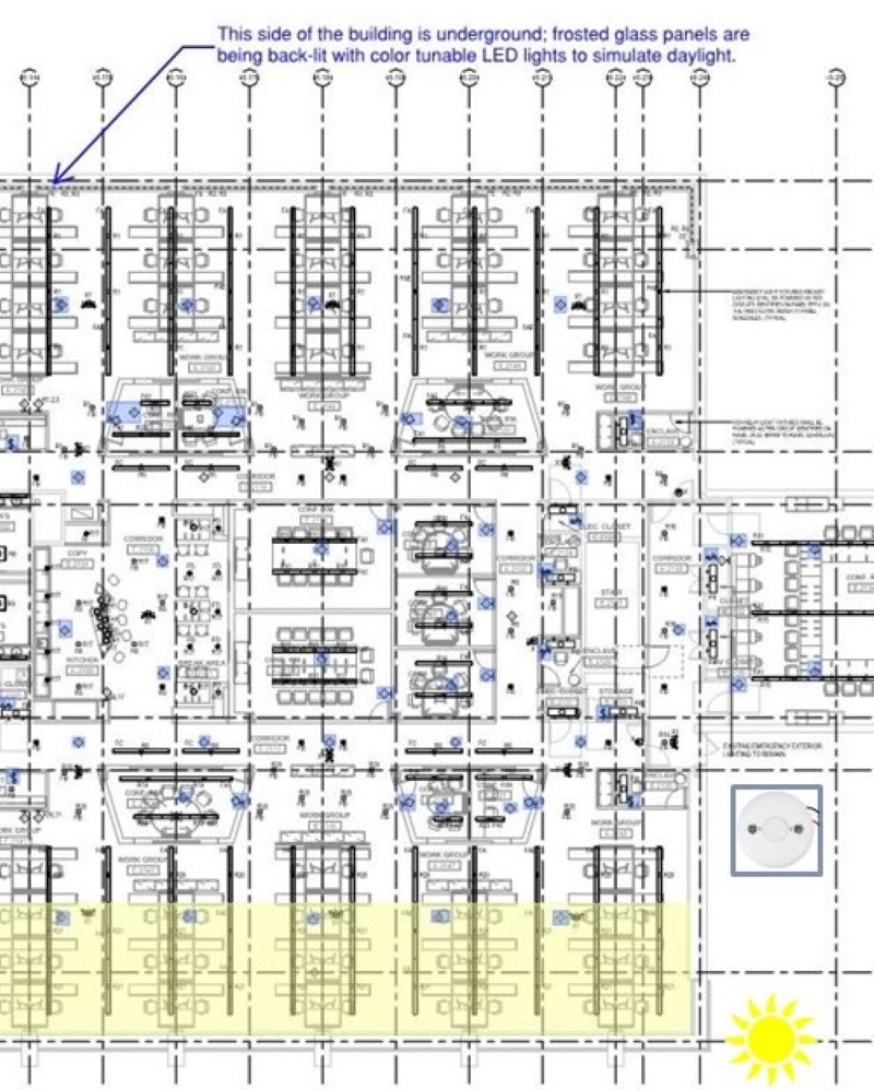 The existing buildings are built into a sloping terrain, presenting a unique challenge for maximizing natural light to workplaces where entire floors and large portions of floors are located below grade with no access to daylight. Tunable white LED fixtures back-light frosted glass placed in the same curtain wall system used elsewhere, and mimic the natural circadian color shift of light through a 24-hour cycle. This strategy allowed 25,000 square feet without access to daylight, previously used for storage and support, to be reclaimed for open office workstations. Success of this design was best illustrated by observing an employee walk toward this glass wall while talking on his phone saying, “Can you hear me now?”