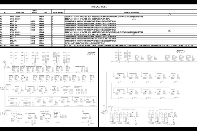Documents provided detailed riser diagrams for lighting and shade controls, as well as a sequence of operation for each relay.