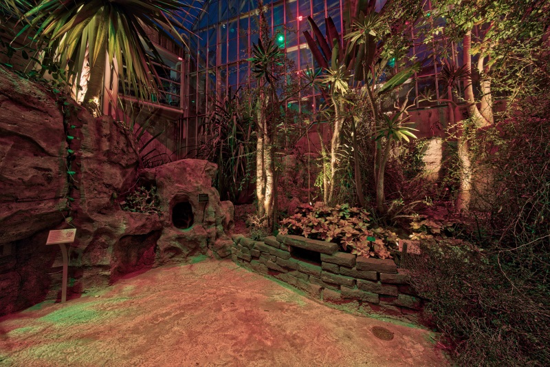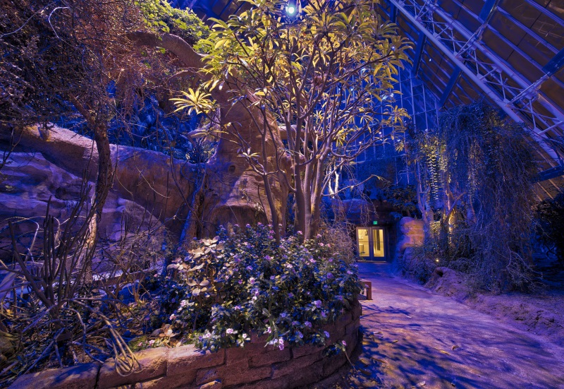 The new system incorporates: upper level color-changing luminaires as well as new midlevel and low level LED accent lighting. The space includes two other-worldly landscapes featuring 350 species of exotic plants and 50 different types of butterflies, birds, reptiles and amphibians through naturalistic habitats. The Glasshouse is considered unique among conservatories because it displays how plants, animals, geology and climate interact in delicate balance.