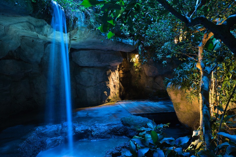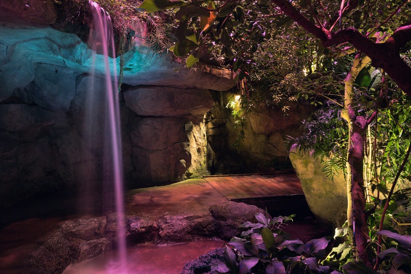 An uplight glow within the cavern stimulates the visitor’s imagination on the journey through the biome, the illuminated trees ahead maintain their path of travel.