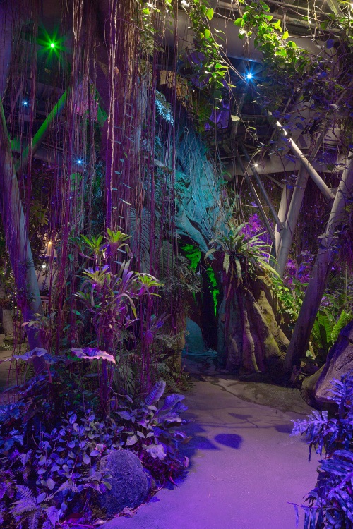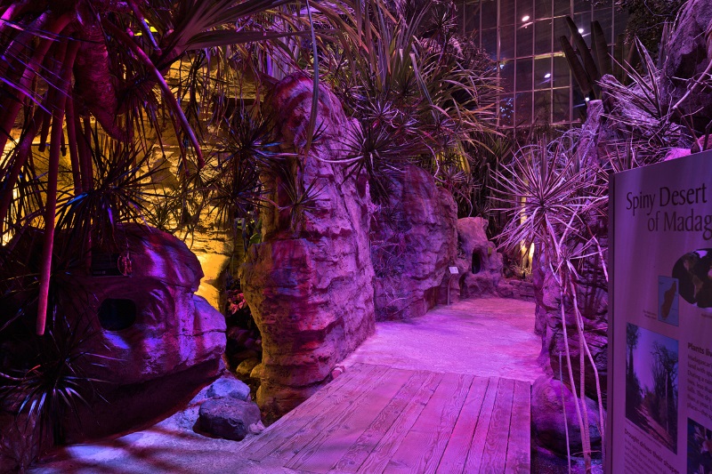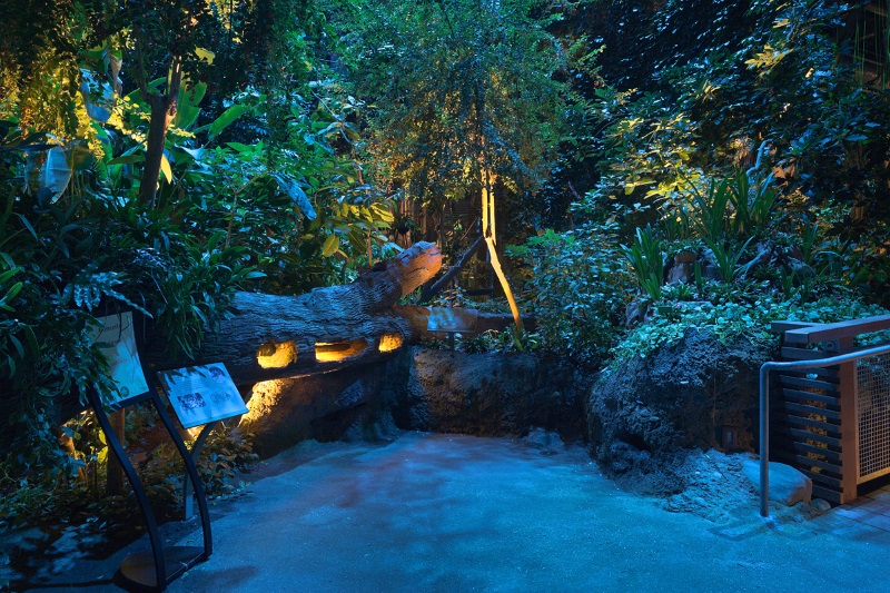 After nightfall, the arid Madagascar Biome becomes a surreal world of spiky plant life and rock lit with a multilayer strategy creating unique viewing moments.