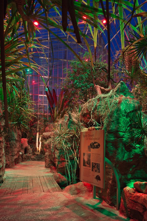 This 18,000 sq.ft Glasshouse in the heart of an urban arts district offers a thrilling year-round escape to the fantastic spiny desert of Madagascar, and the butterfly-filled rain forest of Costa Rica. The Glasshouse was originally constructed in 2003, and this recent lighting renovation included replacement of existing 1000 watt metal halide luminaires to a fully LED lighting system.