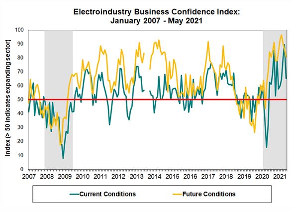 The National Electrical Manufacturers Association (NEMA) recently reported its Electroindustry Business Confidence Index (EBCI) dipped 24 points from a high-water mark in April to 65.4 in May 2021, a significant decline but still solidly in expansionary territory. Comments, largely focused on labor and materials shortages and resultant inflationary pressures, were suggestive of constrained growth.
