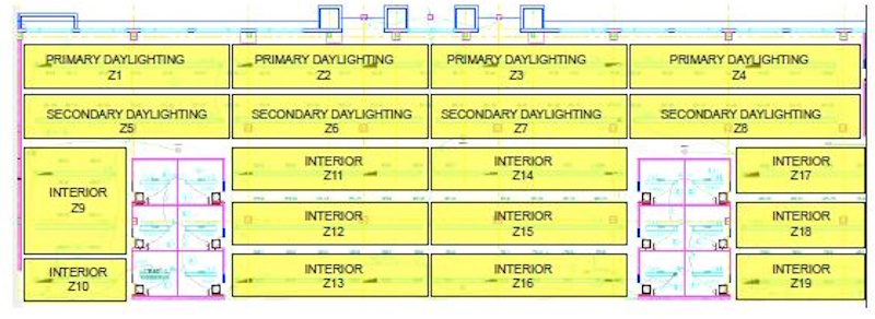 The plan shown here identifies control zoning in compliance with the 2025 code requirements. While zones cannot be larger than 600 sq.ft., designers should consider basing zones on the lighting and furniture layout, which may result in smaller zones.