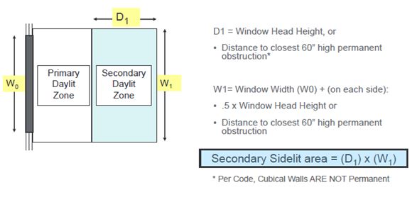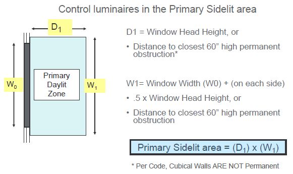 These areas are defined as primary sidelit (adjacent to vertical fenestration such as windows), secondary sidelit (adjacent to primary), and skylit (under toplighting such as skylights) daylit zones.