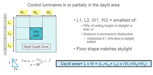 Because daylight-responsive controls apply to general lighting in daylit zones, the first step for compliance is to identify these zones in the building and define their dimensions (this information must be shown on the building plans). The diagrams below show the method for determining the daylight zones. Note that the window head height is the distance from the finished floor to the top of the vertical fenestration (window).