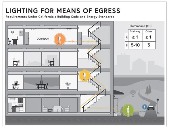 Exceptions include healthcare facilities, lighting operating 24/7, lighting of up to 0.1W/sq.ft. used for egress areas (lighting providing egress illumination must provide no less than what the California Building Code requires while in the Partial Off mode), electrical equipment rooms, and emergency lighting that is only On during a power outage.
