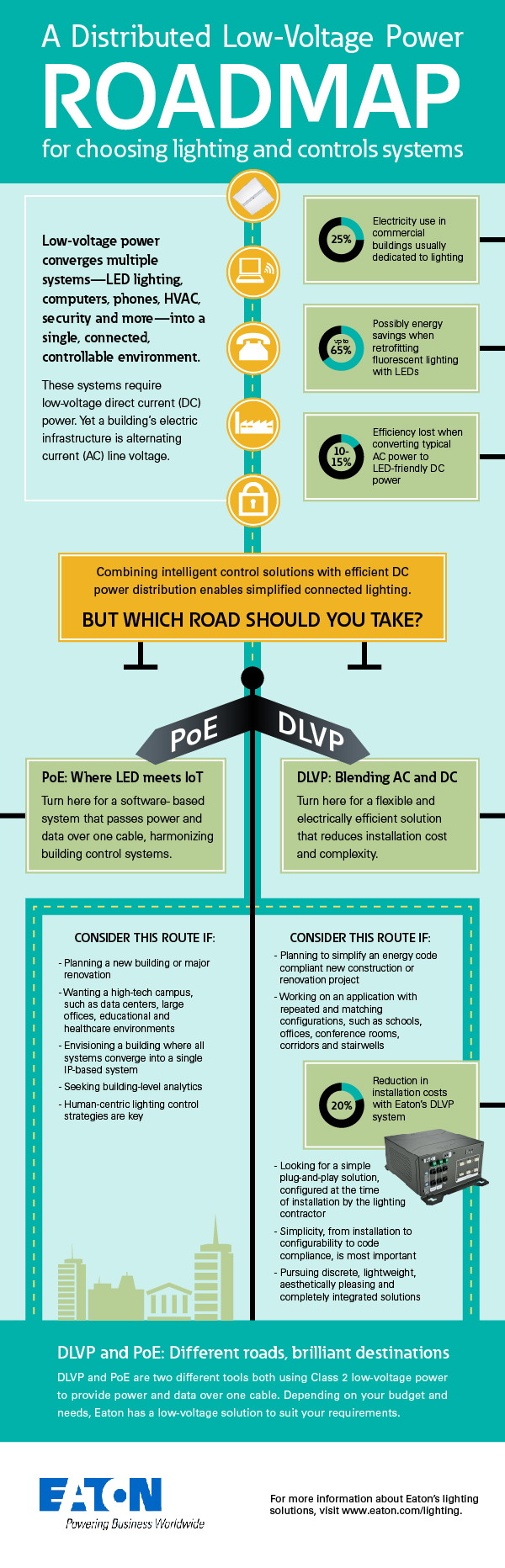 Eaton’s Distributed Low Voltage Power (DLVP) system offers a flexible and electrically efficient low-voltage system combining power, LED lighting and controls into a single project solution that blends the benefits of both AC and DC power distribution. The easily configured “plug-and-play” system reduces installation labor by up to 40% with a total installed system cost savings of up to 20%, according to the company.