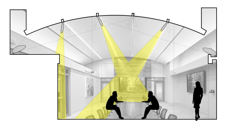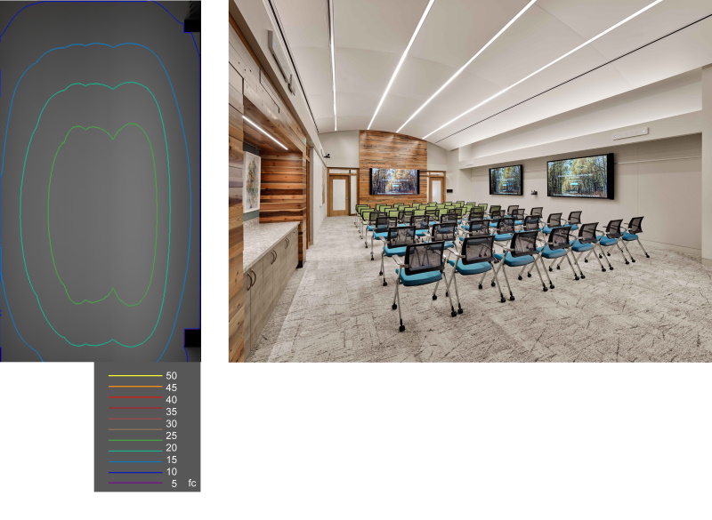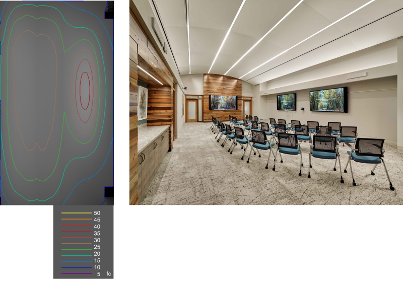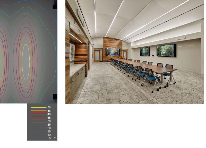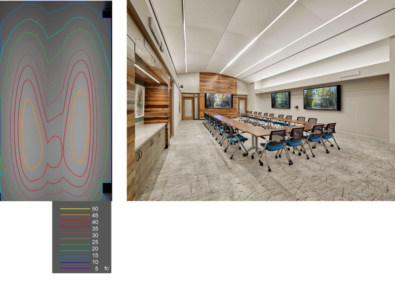 The lighting designer confirmed with the manufacturer that a simple rewiring of their standard product could achieve the control desired. Concealed cove fixtures to wash the arched ceiling provided another layer of light and control. The lighting and controls strategy was communicated to the architects and owners through sectional photometric diagrams of the space and advanced RADIANCE simulations. Close coordination with the architect was required to mesh architecture-driven geometry with lighting-driven geometry. Wall control buttons were engraved with intuitive names for the various furniture arrangements. Occupants have additional manual control, being able to dim down or ramp up each individual scene. In addition, automated daylight dimming was layered over the preset scenes. For any given scene (Board Meeting, Large U, Theater End, Theater Side), less than one third of the recessed linear installed lighting power is used, resulting in an effective LPD of less than 0.7 W/sq.ft. or less than 60% of the 2016 code allowable.