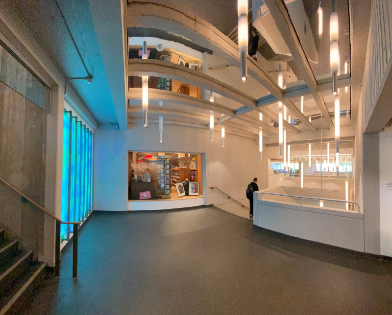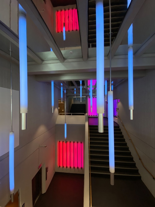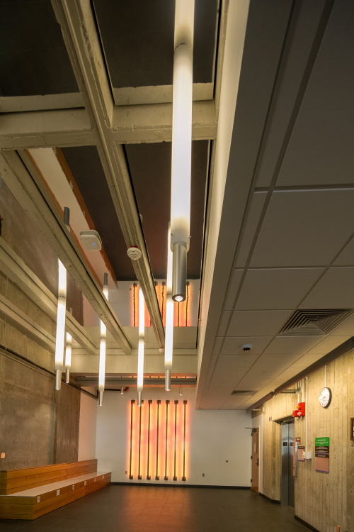 To conceal new wiring, plywood infill panels with mirrored undersides were installed in coffers over circulation. Animated vertical bars pulse steadily, changing color every season.