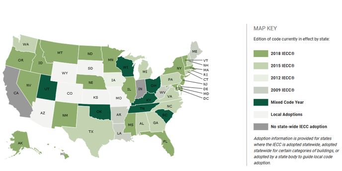 The United States is a patchwork of code adoption. Codes may be adopted for residential or commercial buildings and at various levels of government including Federal, state, and local jurisdictions. At the state level, a majority have adopted codes based on the IECC, while some base it on the ANSI/ASHRAE/IES 90.1 energy standard, developed their own code, or have no statewide code.