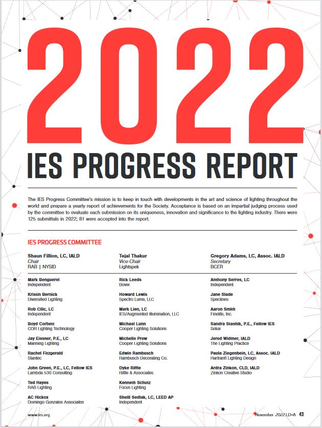 The Illuminating Engineering Society (IES) recently announced that its Progress Committee has selected 81 design tools, products and publications for the 2022 IES Progress Report—an annual list covering developments in light and science achievements for the Society from around the globe.