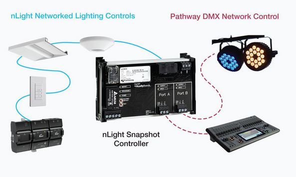 The nLight Snapshot Controller leverages DMX technology developed by Pathway Connectivity Solutions, which provides a dynamic DMX lighting network for projects that include RGBX or entertainment lighting. A part of Acuity Brands, Pathway offers a family of innovative products that enable theatrical, commercial, and architectural lighting systems.