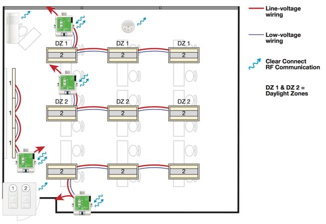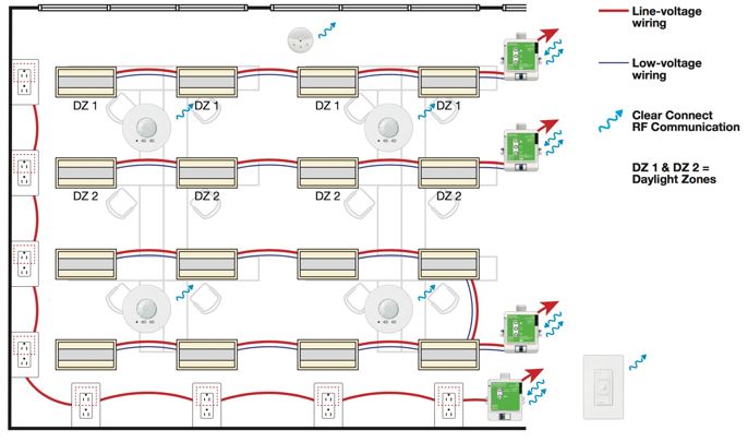 As a result, it’s easy to comply with the code requirements for zoning luminaires in primary and secondary daylight zones whether luminaire-level lighting controls are used or high-amperage controllers are used to control each row.