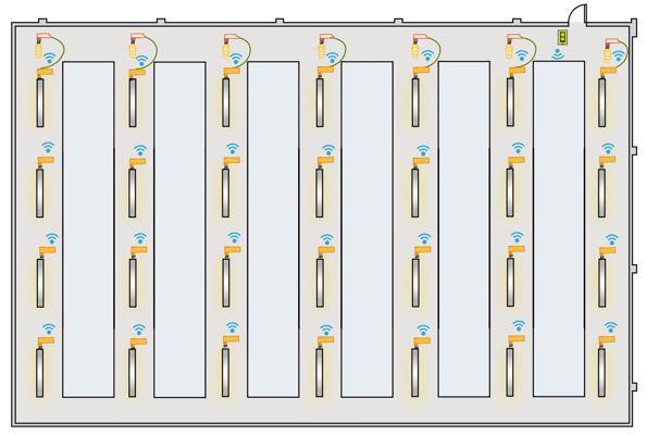 In the system shown below, each luminaire has an integral controller (for turning the luminaire on and off and dimming it). Standalone occupancy sensors are installed at the north end of each row, mounted separately from the luminaires. In this system, a sensor interface is tethered by low-voltage wire to the nearest luminaire controller. Therefore, the signal for the sensor information passes through the wireless controller in the luminaire and back to the gateway/server.