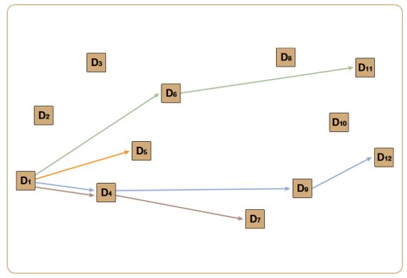 In a self-healing mesh network, data flows between devices (D1, D6, D11 shown here) to communicate between a gateway and a given control point. If a device fails, the signal flow automatically reroutes through other devices (“self-healing”) (D1, D6, D9, D10, D11), which increases reliability through multiple nodes and redundancy of nodes.