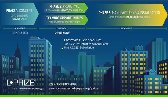 The U.S. Department of Energy L-Prize challenges industry to bring forward new innovations to realize the full potential of advanced lighting systems for commercial buildings. The competition has three distinct phases: Concept Phase winners were announced in February 2022, the Prototype Phase opened in June 2022, and the Manufacturing and Installation Phase is expected to open in September 2023. Participation in the Concept Phase is not required to participate in the Prototype Phase. The L-Prize Prototype Phase “Intent to Submit” deadline is January 13, 2023.