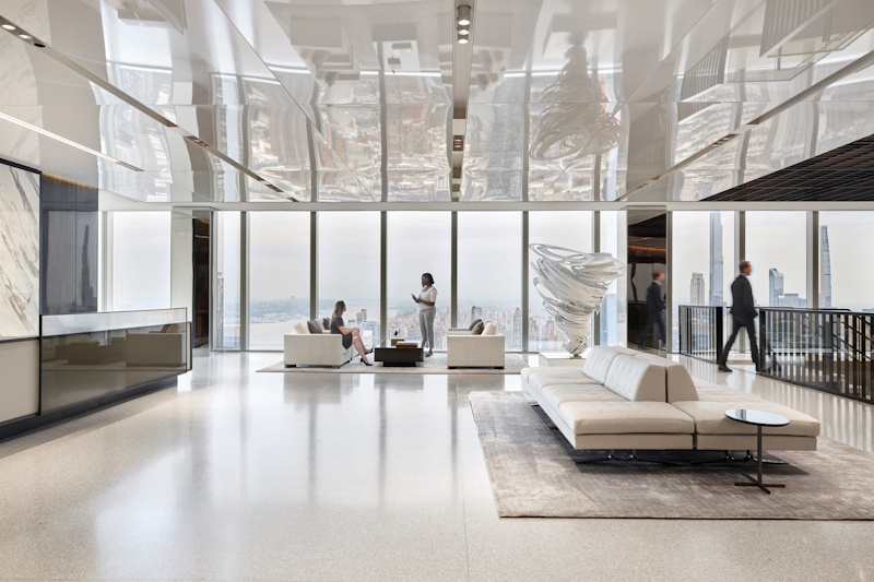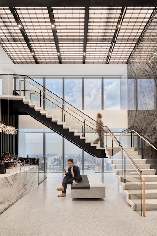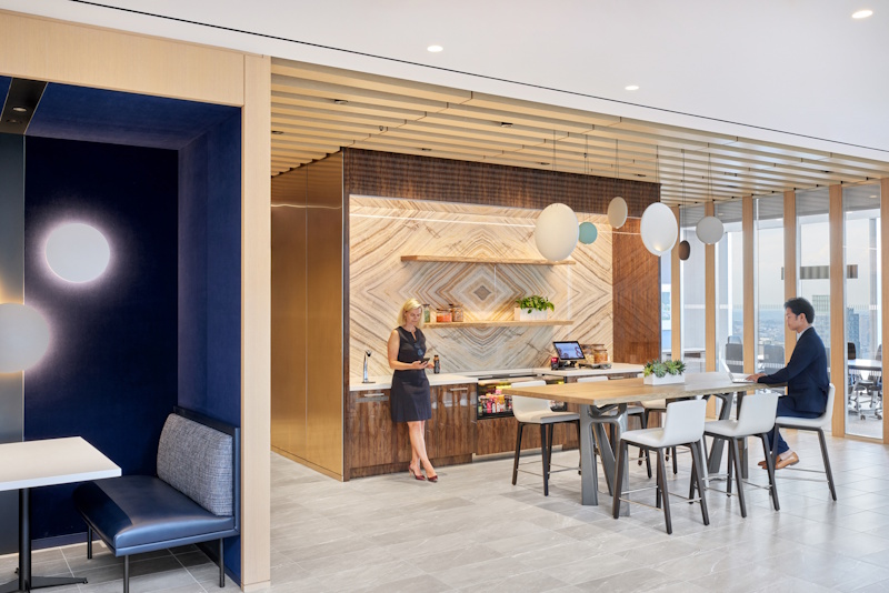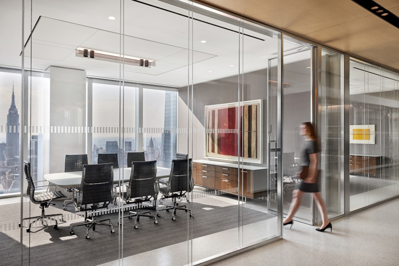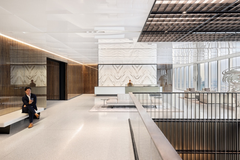 Perimeter mounted narrow grazers feature book-matched wood and marble walls, balancing the visual contrast of the building core with the sun-drenched perimeter windows.