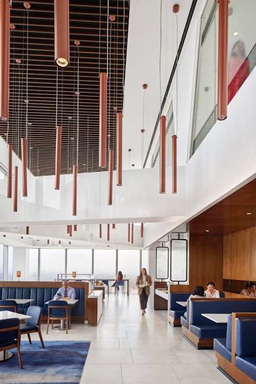 Custom, individually controlled direct/indirect pendants provide flexible lighting scenes for the café’s many functions – daytime dining, evening cocktail events and flexible furniture arrangements.