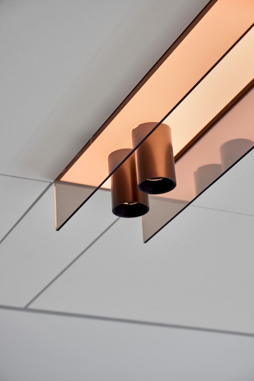 Triplets of downlights integrated into architectural channels use combinations of narrow and flood optics to highlight furniture and art while also providing general lighting.