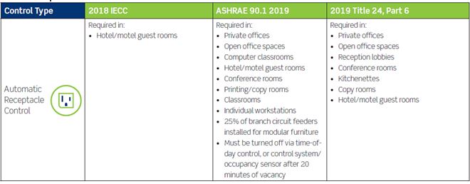 It’s not just smart, it’s the code. Energy codes require Receptacle Control or Plug Load Control. Both ASHRAE Standard 90.1 2010/2013/2016/2019 and 2019 Title 24, Part 6 require controlled receptacles to have the same automatic shutoff function as lighting using either occupancy sensing or schedule-based control. Plug-in strips and devices cannot be used for code compliance.