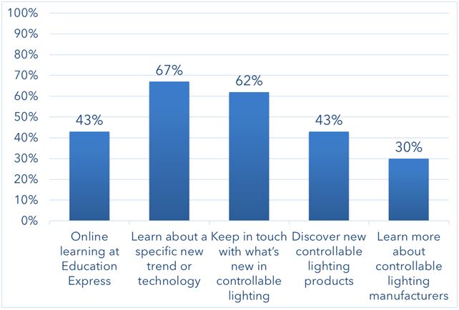 The most popular reasons visitors come to the LCA website is to learn about a specific new trend or technology (67%) and keep in touch with what’s new in controllable lighting (62%). Other significant reasons were online learning at Education Express (43%), discover new controllable lighting products (43%), and learn about controllable lighting manufacturers (30%).