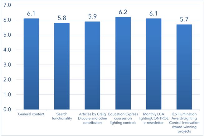 Looking at specific features, the most highly rated features are Education Express (6.2), monthly e-newsletter lightingCONTROL (6.1), general content (6.1), and articles by Craig DiLouie and other contributors (5.9).