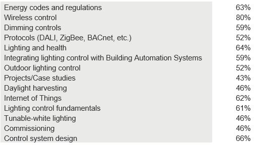 Finally, respondents indicated topics they would like to see LCA cover more on its website and in lightingCONTROL (checking all that applied from a list of topics). The most five popular topics are wireless control (80%), networked lighting controls (72%), control system design (66%), lighting and health (64%), and energy codes and regulations (63%). LCA will emphasize these topics in the coming year in its coverage of the lighting controls field.