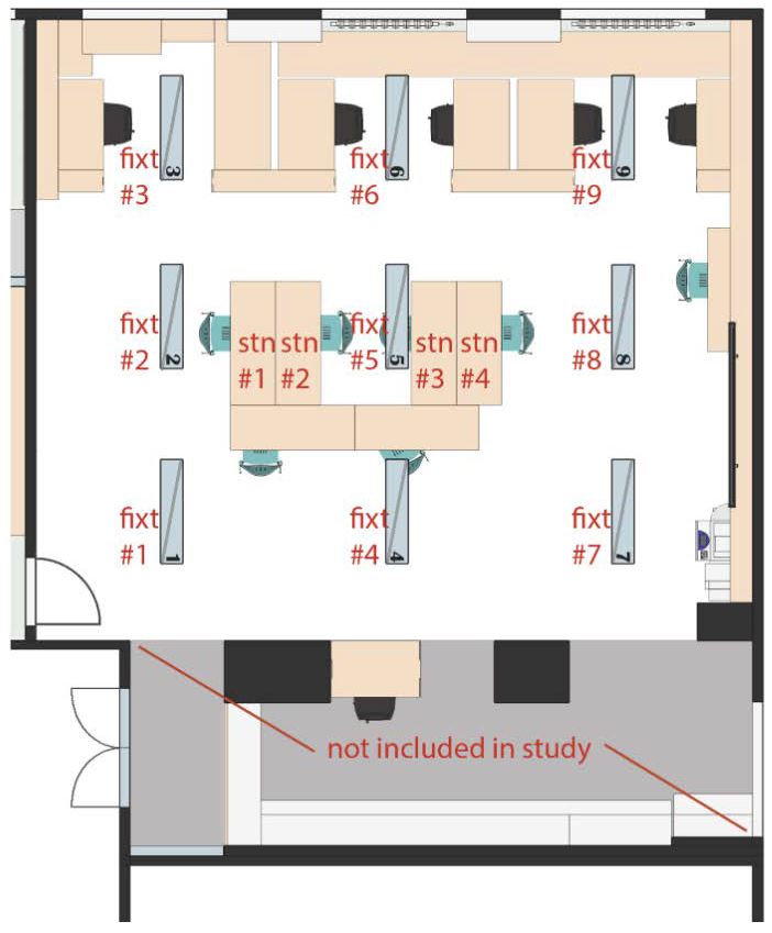 The researchers set up four workstations at the center of an 891-sq.ft. space that was 33 ft. wide east-west and 27 ft. deep north-south, with perimeter glazing along the northern face, as shown in the below plan. The baseline lighting system consisted of nine 4-ft. indirect/direct 32W T8 pendant luminaires laid out on a 3×3 grid and controlled by a wall switch.