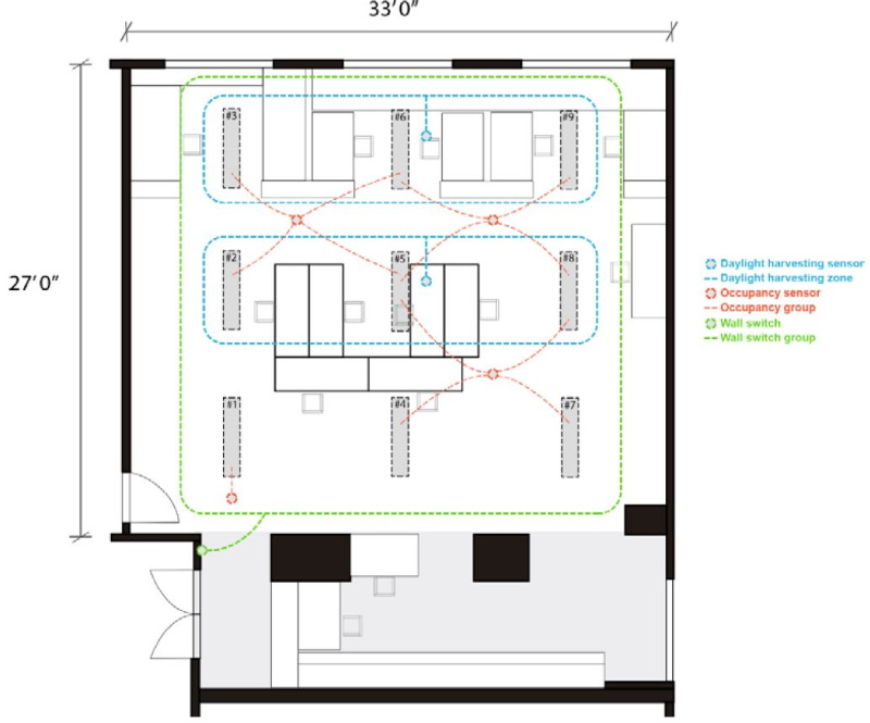 Five systems were installed, which included four LLLC options of increasing features (most of them qualifying them as networked lighting control systems themselves) along with a more comprehensive NLC system. The NLC redesign system featured remote ceiling-mounted sensors (four occupancy, two daylight, configured as shown below) and software-based control zoning of luminaires as well as data output for space utilization and asset tracking. All options involved a one-for-one replacement of the fluorescent luminaires with LED luminaires tuned to produce around 30 footcandles.