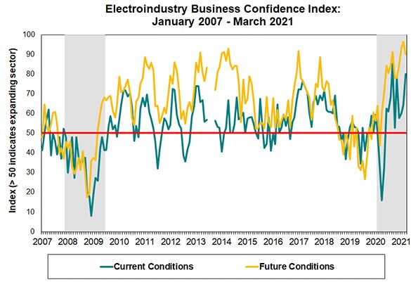 For the tenth consecutive month, the National Electrical Manufacturers Association (NEMA) Electroindustry Business Conditions Index (EBCI) topped 50 points, indicating conditions conducive to growth. March’s reading of 80 built on an already robust 64.3 in February and was driven by two-thirds of survey respondents’ indicating better conditions.