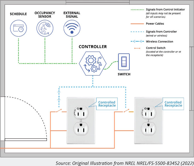Controlling these loads is a natural extension of lighting control systems, as the same strategies and devices used for automatic switching of general lighting can be deployed for plug load control at the receptacle or circuit level. Incorporating plug load control for energy code compliance or for an energy-saving upgrade increases the value of lighting control and enhances building energy efficiency.