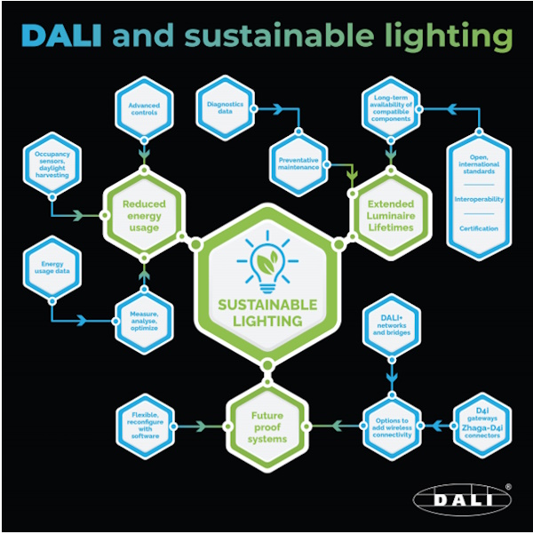 Figure 2. DALI can make important contributions to sustainable lighting systems via future-proofing, extended luminaire lifetimes and reduced energy usage.