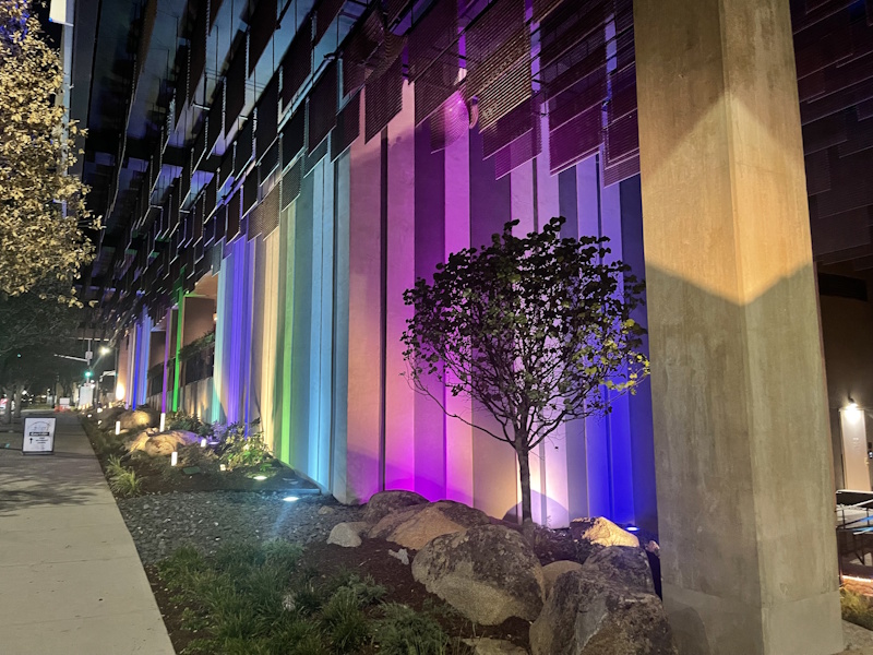 Two DMX control universes provide unlimited flexibility to create dynamic effects, including changing colors, different lighting patterns, and ultimately a vertical rain effect was selected.