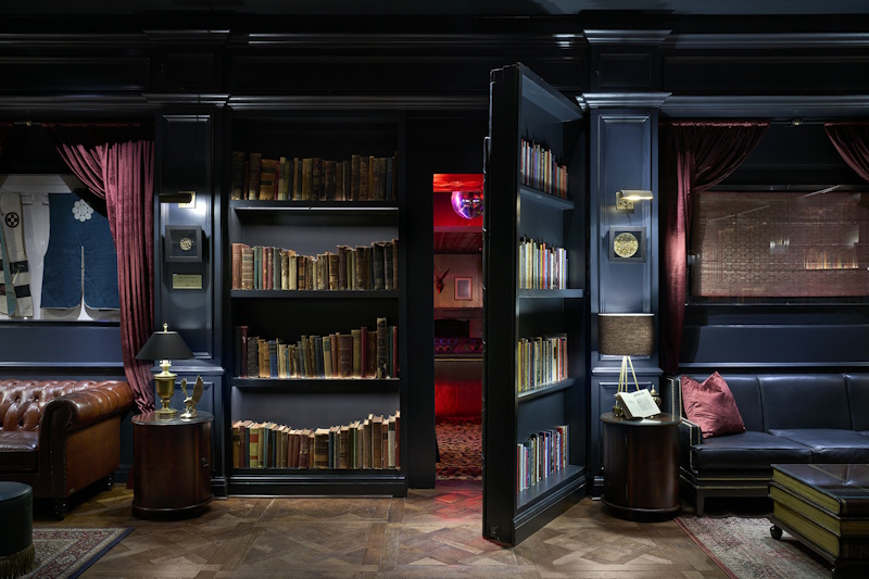 Special contact hinges allow for continuous dimmed light on shelves and create secret passage.