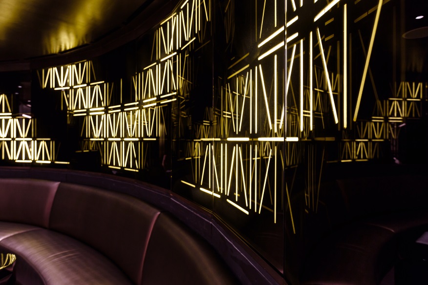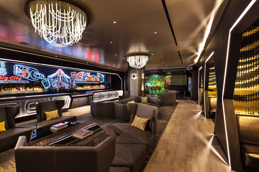 This renovation of an iconic hotel lobby pulls inspiration from a neon cityscape at the height of the New Year’s Eve celebration. Two feature walls, flanking the reception desk and a disco ball-shaped DJ booth, compose a mega-scale, undulating art piece that intermittently display a countdown clock to the big moment.