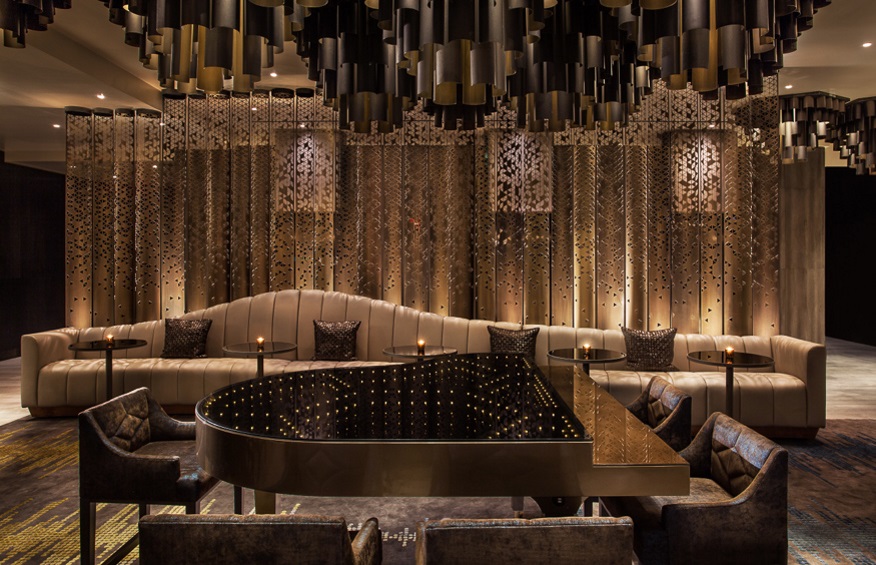 Multiple layers of uplights, tiered pendants, and an LED infinity piano create architectural depth reminiscent of a metropolitan skyline.